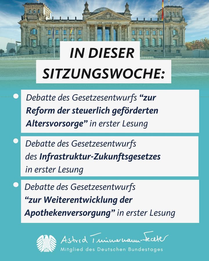 In dieser Sitzungswoche werden im Plenum des Deutschen Bundestages wieder eine Vielzahl von wichtigen Themen beraten, um Verbesserungen für die Menschen in unserem Land zu erreichen.Mit dem Entwurf eines Gesetzes zur Reform der steuerlich geförderten Altersvorsorge soll ein kostengünstiges, einfaches und transparentes Angebot an neuen privaten Altersvorsorgeprodukten ermöglicht werden. Der Entwurf eines Infrastruktur-Zukunftsgesetzes stellt wesentliche Verkehrsinfrastrukturen in das überragende öffentliche Interesse, um klarzustellen, dass diese der öffentlichen Sicherheit dienen und einen Schutzgütervorrang genießen. Mit dem Entwurf eines Gesetzes zur Weiterentwicklung der Apothekenversorgung werden Apotheken wirtschaftlich gestärkt und mit mehr Befugnissen ausgestattet, um das Versorgungsangebot zu erweitern und verbesserte Rahmenbedingungen für inhabergeführte Apotheken zu schaffen.